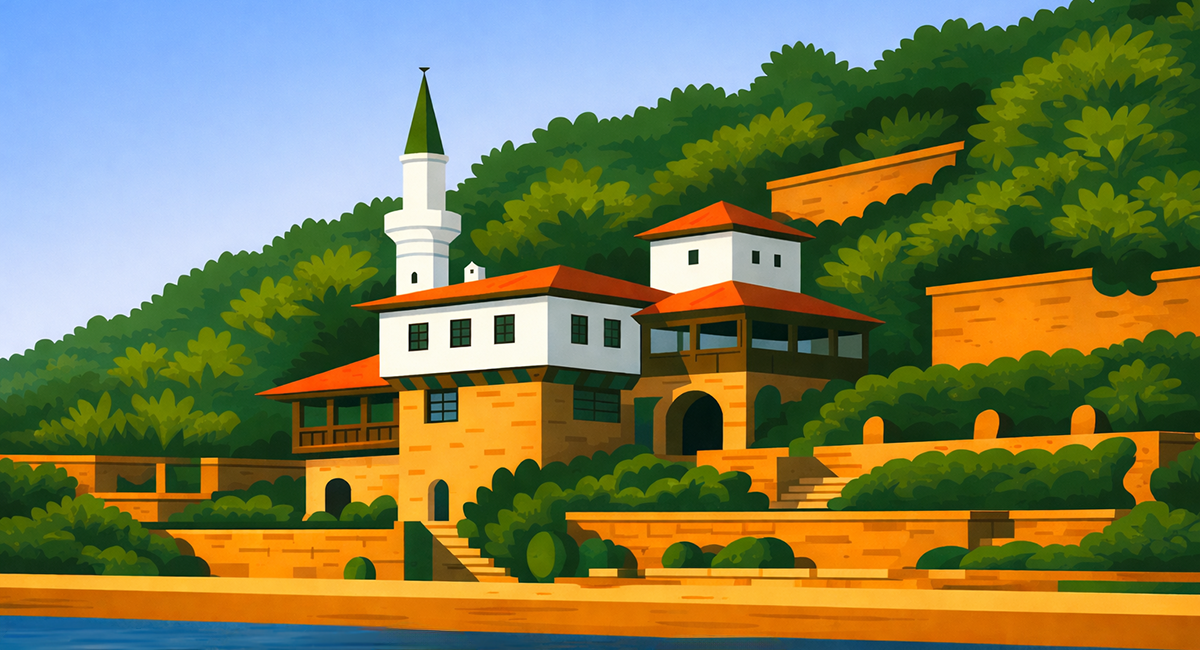 - Главната резиденция (Дворецът) – едноетажна вила с кула-минаре, типично за ориенталската архитектура, съчетаваща и православни, и мюсюлмански мотиви.