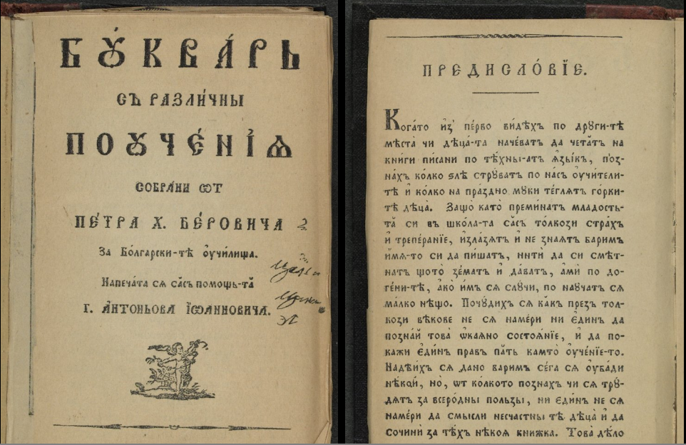 „Буквар с различни поучения“ на Петър Берон (1824) е лиминална книга на Българското възраждане – текст на прехода между килийната книжнина и модерния учебник, между сакралната функция на писменото слово и светската рационалност на просвещението. Неговата известност – и под името „Рибен буквар“ – често се опира на митологизирани представи, докато реалният „живот“ на книгата включва сложна история на създаване, материалност, редакции, рецепция и преосмисляне в различни издателски и педагогически контексти от 1820-те до 1860-те години. Когато се разглежда като артефакт и като учебна програма в миниатюра, букварът се разкрива като съзнателна педагогическа конструкция: чрез последователност от езикови уроци, „различни поучения“, енциклопедични фрагменти и илюстративни таблици той въвежда децата в нов тип знание – подредено, достъпно и приложимо, а не ритуално-литургично. Първото издание, отпечатано в Трансилвания (традиционно приписвано на Брашов, с аргументи за възможен Сибиу), е на ръчна парцалена ленена хартия и църковнославянски кирилски шрифт; по-късните букурещки и цариградски издания преминават към машинна памучна хартия, литографски изображения и разширен корпус от текстове, включително теми като „въздушни явления“. В българската културна памет прозвището „рибен“ възниква по-късно, синхронно с увеличаването на морската тематика и целта да се отличи този буквар сред лавинообразно множащите се учебници след 1840 г. Настоящият анализ проследява историческия контекст, структурата, материалността и рецепцията на книгата, за да изведе механизмите, чрез които един компактен буквар се превръща в институция на модерното българско образование.